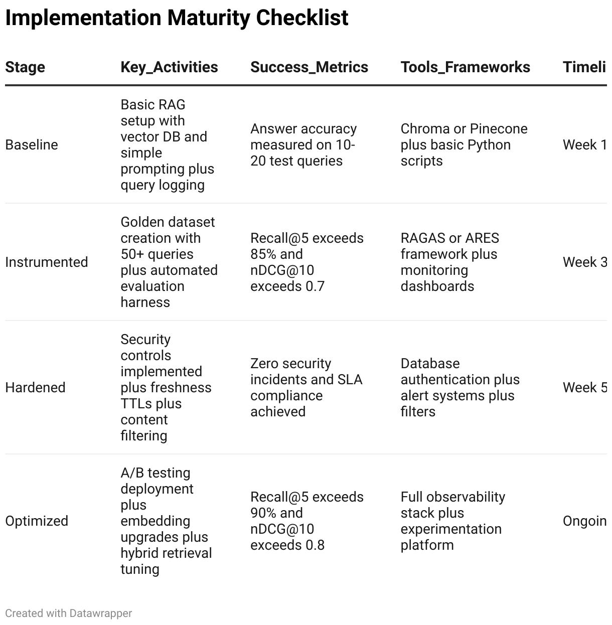 Implementation maturity checklist showing progression from baseline to optimized context engineering phases