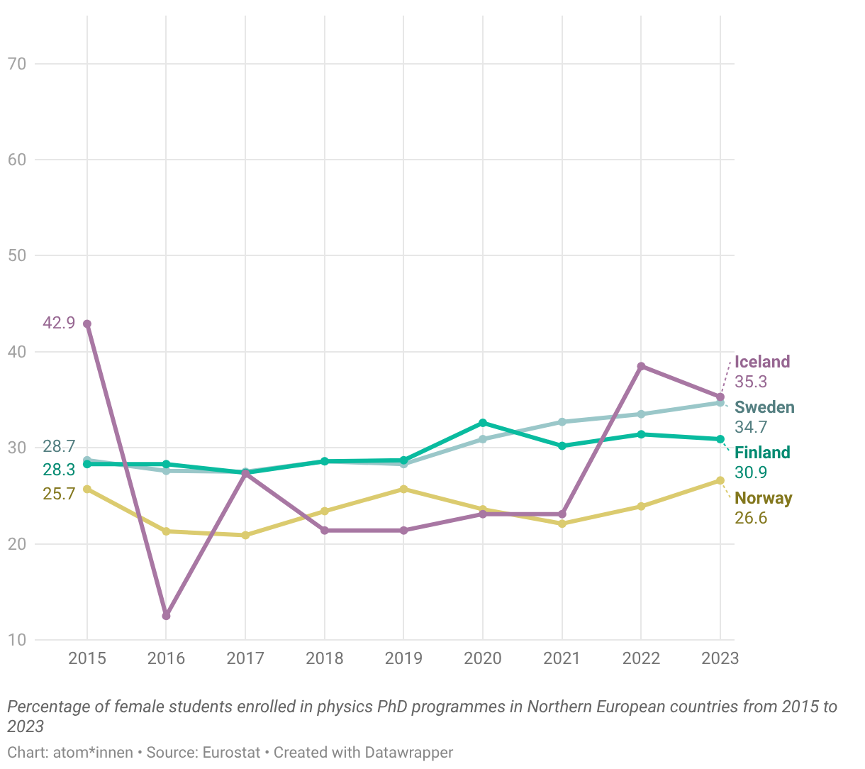 Percentage of female students enrolled in physics PhD programmes in Northern European countries from 2015 to 2023