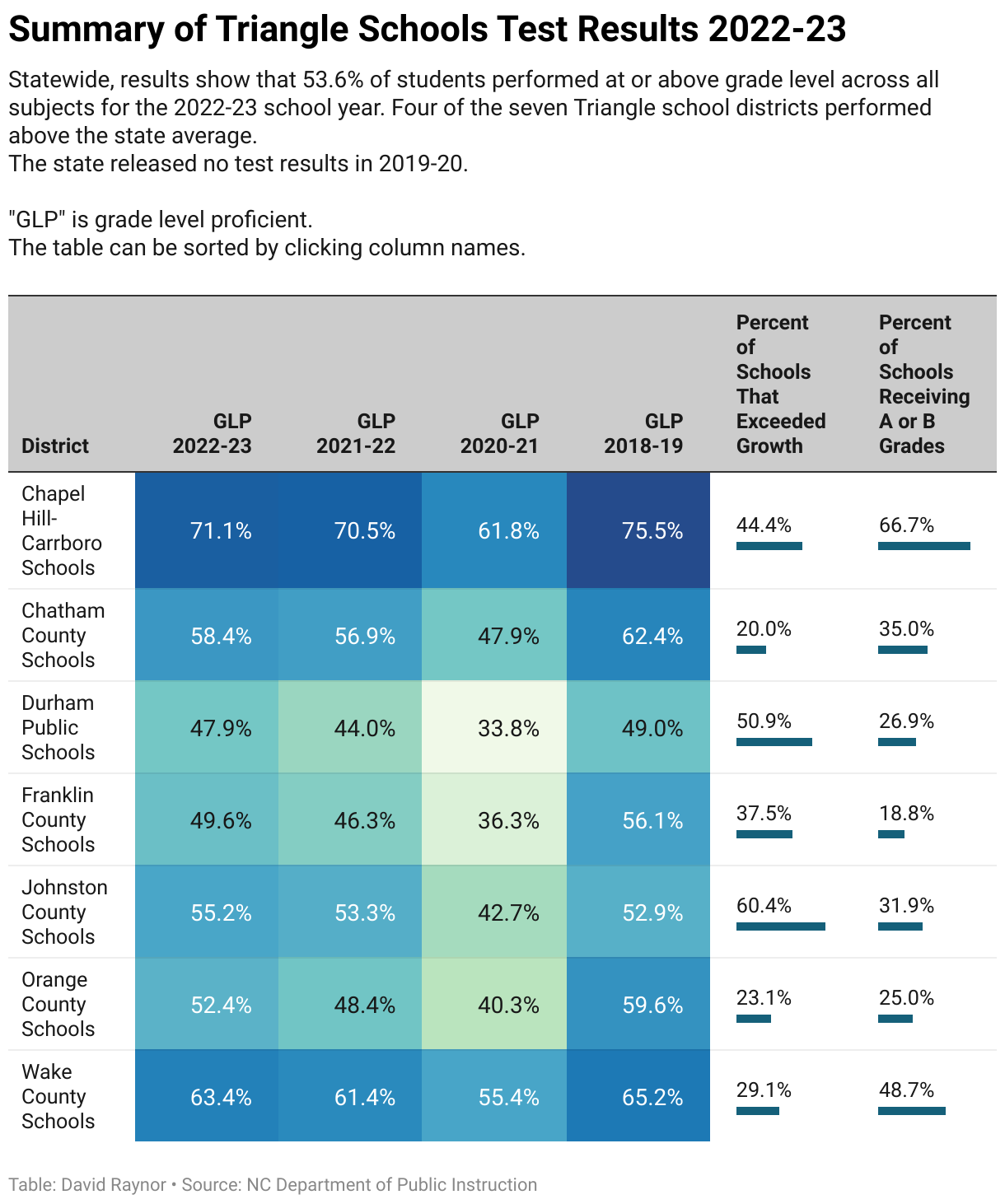 Statewide, results show that 53.6% of students performed at or above grade level across all subjects for the 2022-23 school year. Four of the seven Triangle school districts performed above the state average.