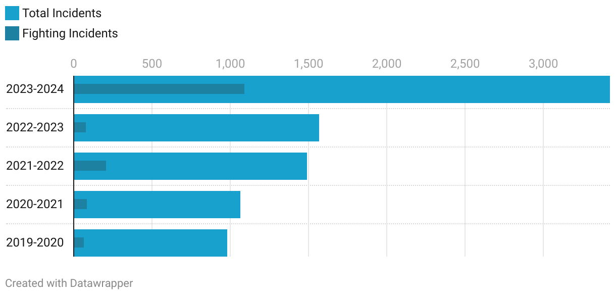 Marion County reported the highest number of total incidents in the past five years during the 2023-24 school year, with fights making up nearly one-third of all cases.