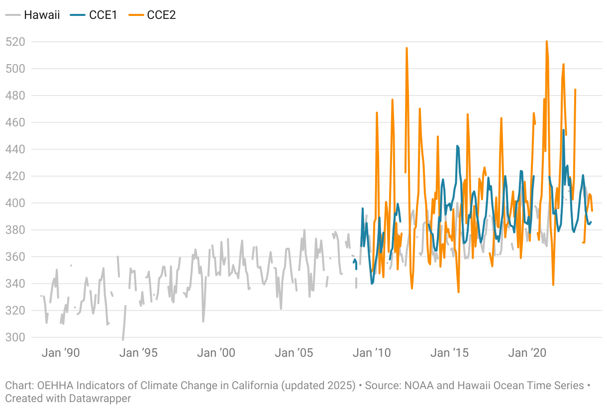 This graph shows rising CO2 levels in the coast off of Hawaii dating back to 1988. More recent measurements of CO2 levels 140 miles off the coast of Point Conception, California, follow a similar pattern as Hawaii. Closer to shore, CO2 levels off of Point Conception are highly variable.