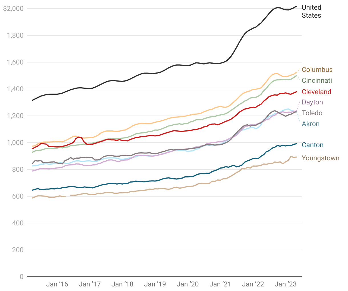 Apartments in Ohio's metropolitan areas remain affordable by national standards, but typical rents have been climbing.