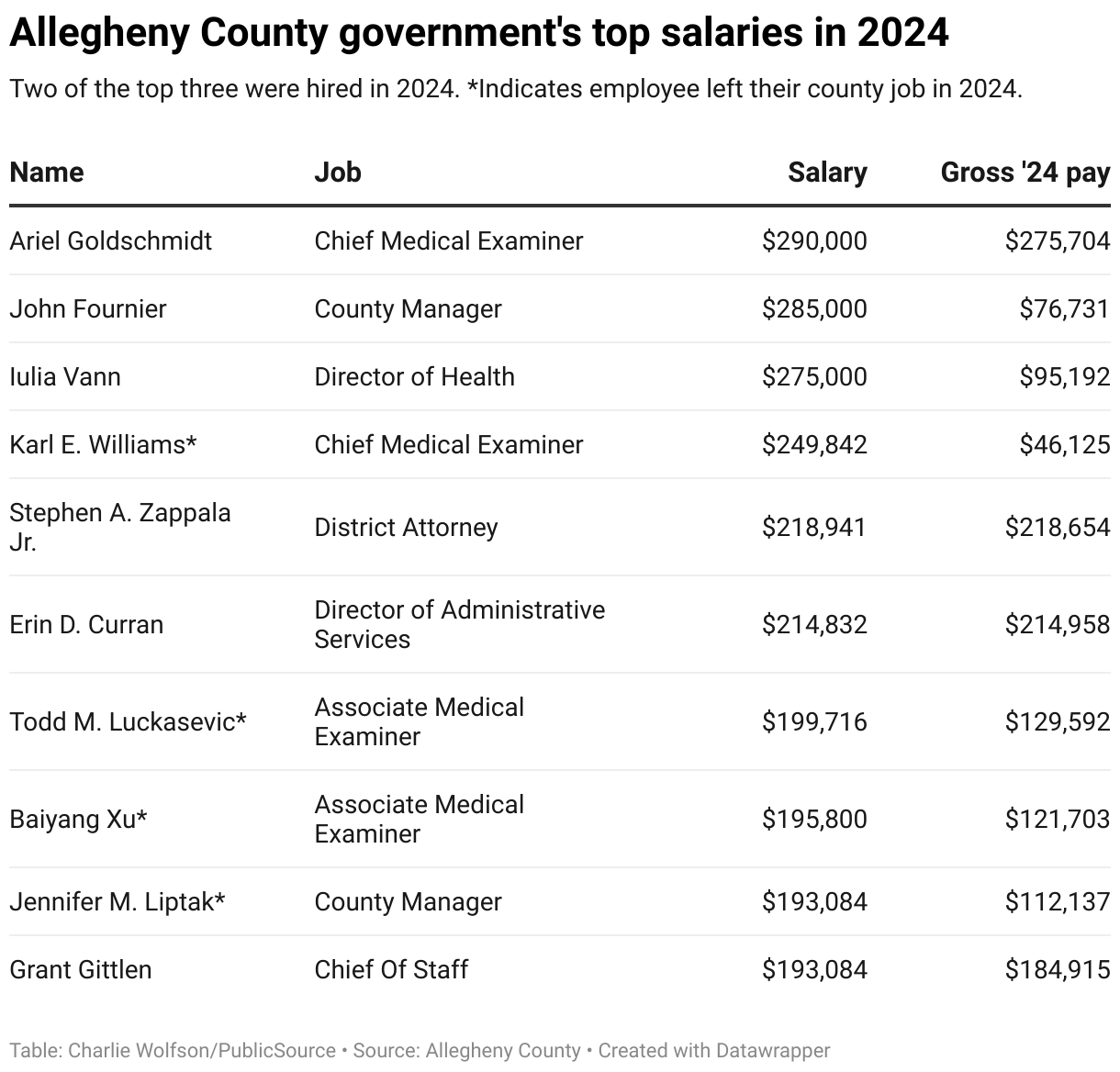 Two of the top three were hired in 2024. *Indicates employee left their county job in 2024.