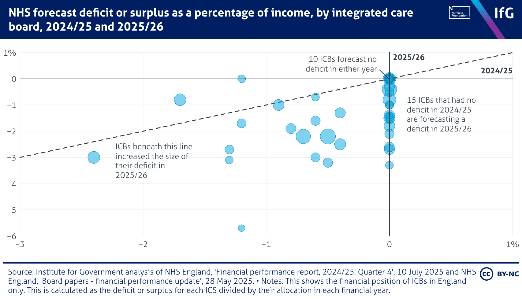 A scatter plot from the Institute for Government showing NHS forecast deficit or surplus as a percentage of income by integrated care board (ICB) for 2024/25 and 2025/26. While 10 ICBs forecast no deficit in either year, 15 ICBs that had no deficit in 2024/25 are projecting a deficit in 2025/26.