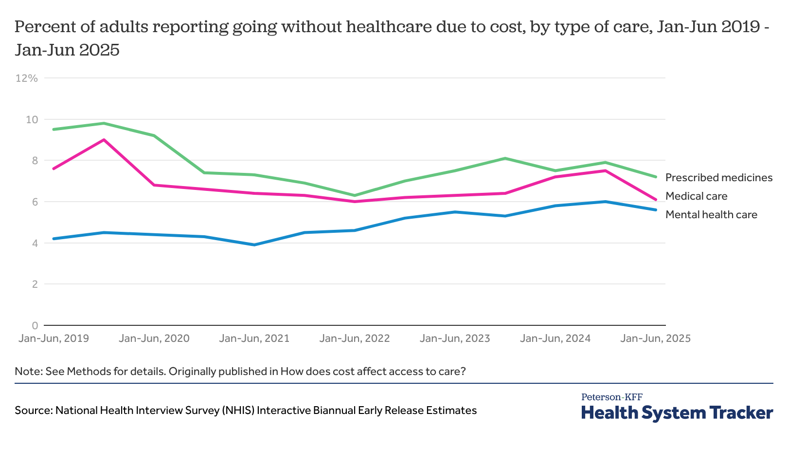 Percent of adults reporting going without healthcare due to cost, by type of care, Jan-Jun 2019 - Jan-Jun 2025