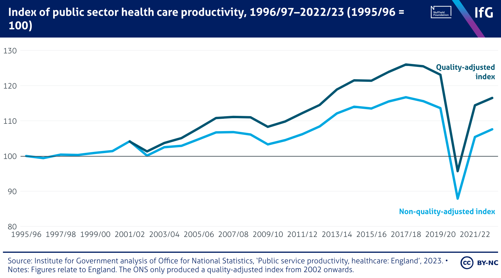 A line chart from the Institute for Government showing the index of public sector health care productivity, 1996/97–2022/23 (1995/96 = 100). Productivity rose steadily from the mid-2000s, with quality-adjusted productivity peaking at 126 in 2017/18, while non-quality-adjusted productivity reached about 117. Both fell sharply during the pandemic to 96 and 88 respectively in 2020/21, before partially recovering by 2022/23, reaching 117 and 108.