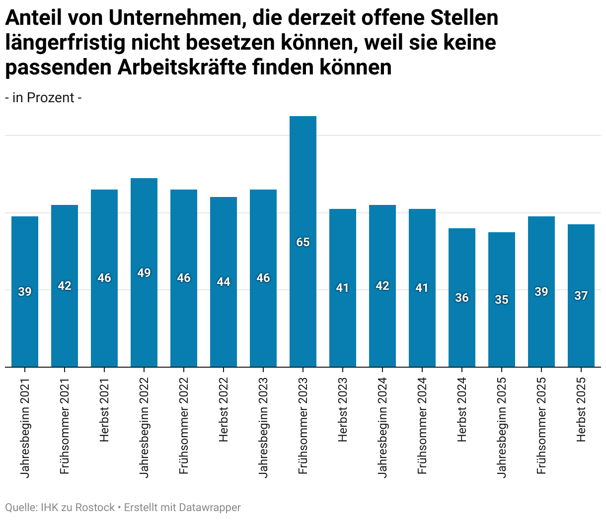 Das Balkendiagramm zeigt den Anteil der Unternehmen mit langfristig unbesetzten Stellen aufgrund fehlender Fachkräfte von 2021 bis 2025. Der Wert schwankt zwischen 35 % und 49 %, mit einem Spitzenwert von 65 % im Frühsommer 2023. Zuletzt liegt der Anteil bei 37 % im Herbst 2025.