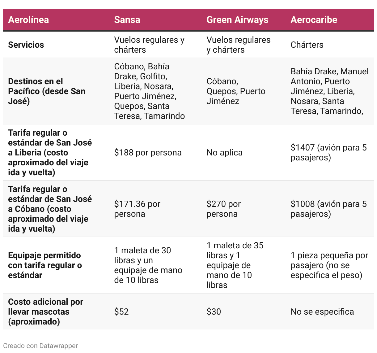 Estas son algunas opciones que ofrecen tres aerolíneas en Costa Rica. Aquí se incluyen precios de referencia, que pueden variar al momento de reservar.