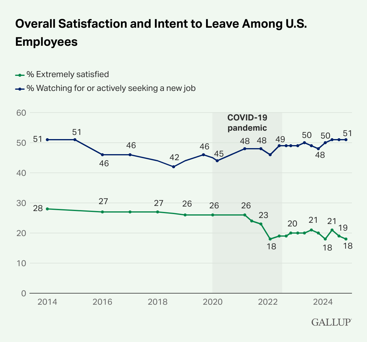 Line chart. After the pandemic, employees' satisfaction with their place to work dropped, and their intent to leave rose. In November 2024, 51% of U.S. employees said they are looking for a new job, and 18% said they are extremely satisfied with their employer as a place to work.