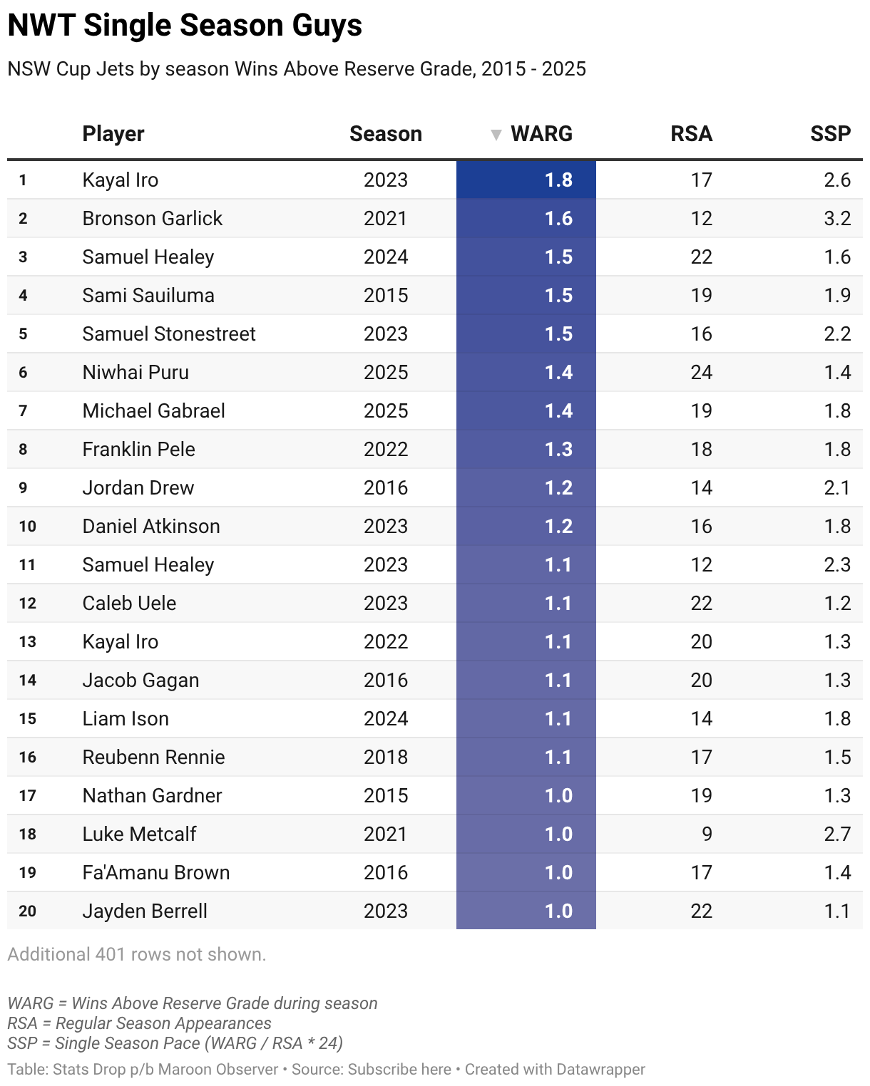 NSW Cup Jets by season Wins Above Reserve Grade, 2015 - 2025
