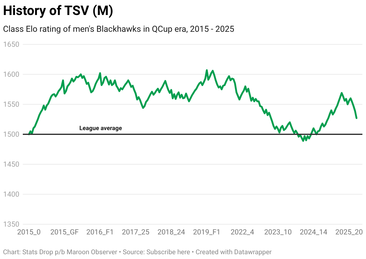 Class Elo rating of men's Blackhawks in QCup era, 2015 - 2025
