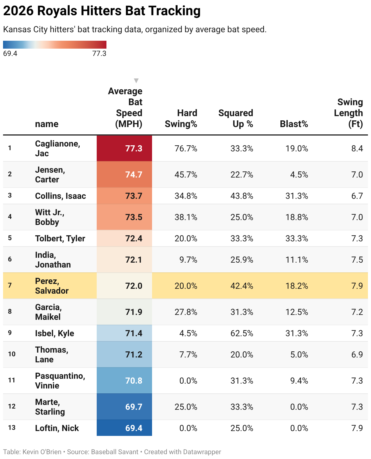 Kansas City hitters' bat tracking data, organized by average bat speed.