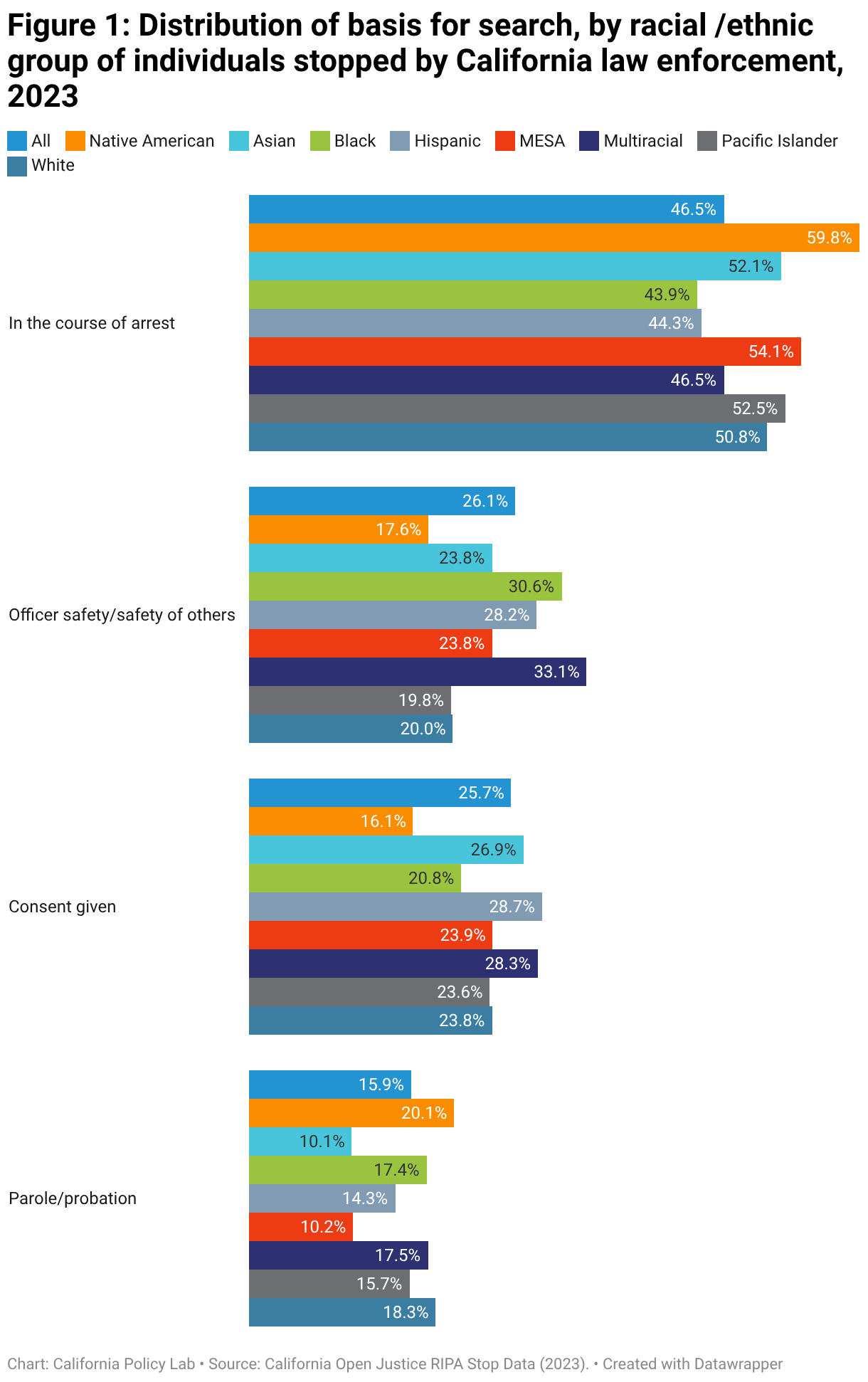Figure 1: Distribution of basis for search, by racial /ethnic group of individuals stopped by California law enforcement, 2023