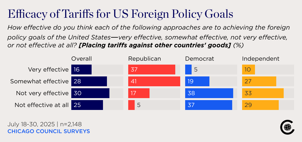 How effective do you think each of the following approaches are to achieving the foreign policy goals of the United States—very effective, somewhat effective, not very effective, or not effective at all? [Placing tariffs against other countries' goods] (%)