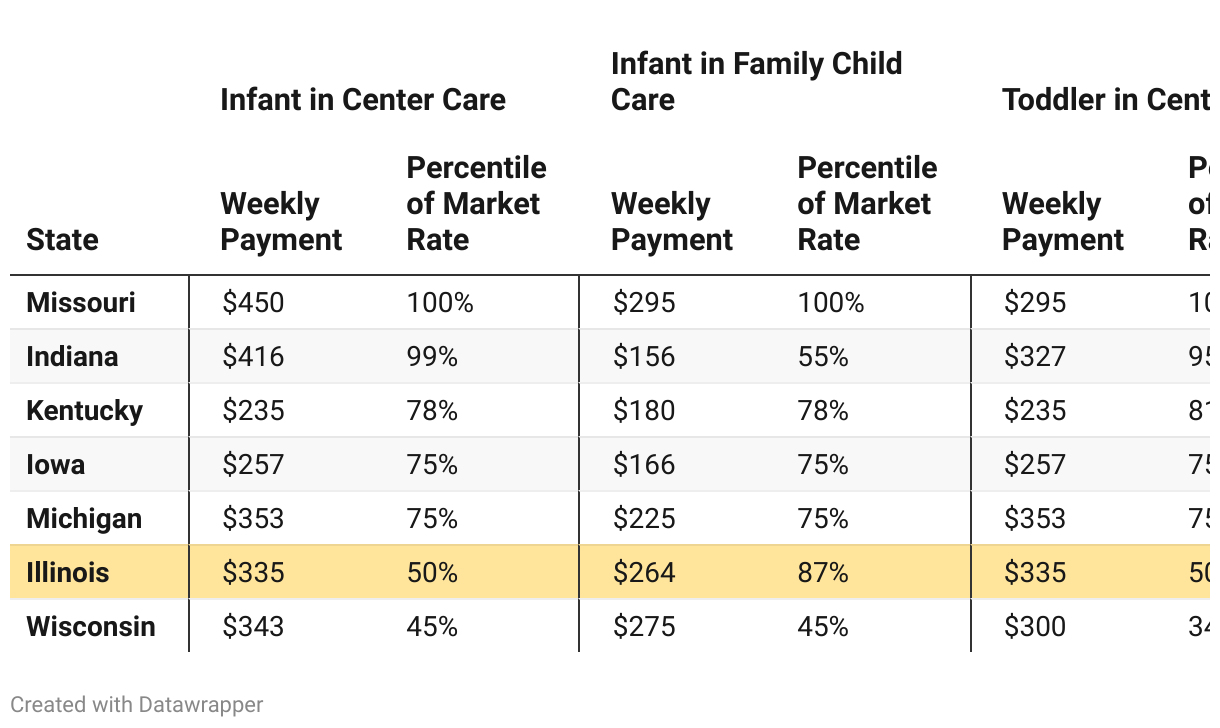 The federal government recommends states set CCAP payment rates that allow parents to afford at least 75% of the local child care options. The following table shows the base dollar amount Illinois and neighboring states will pay to providers and the portion of the market parents can access with that subsidy.