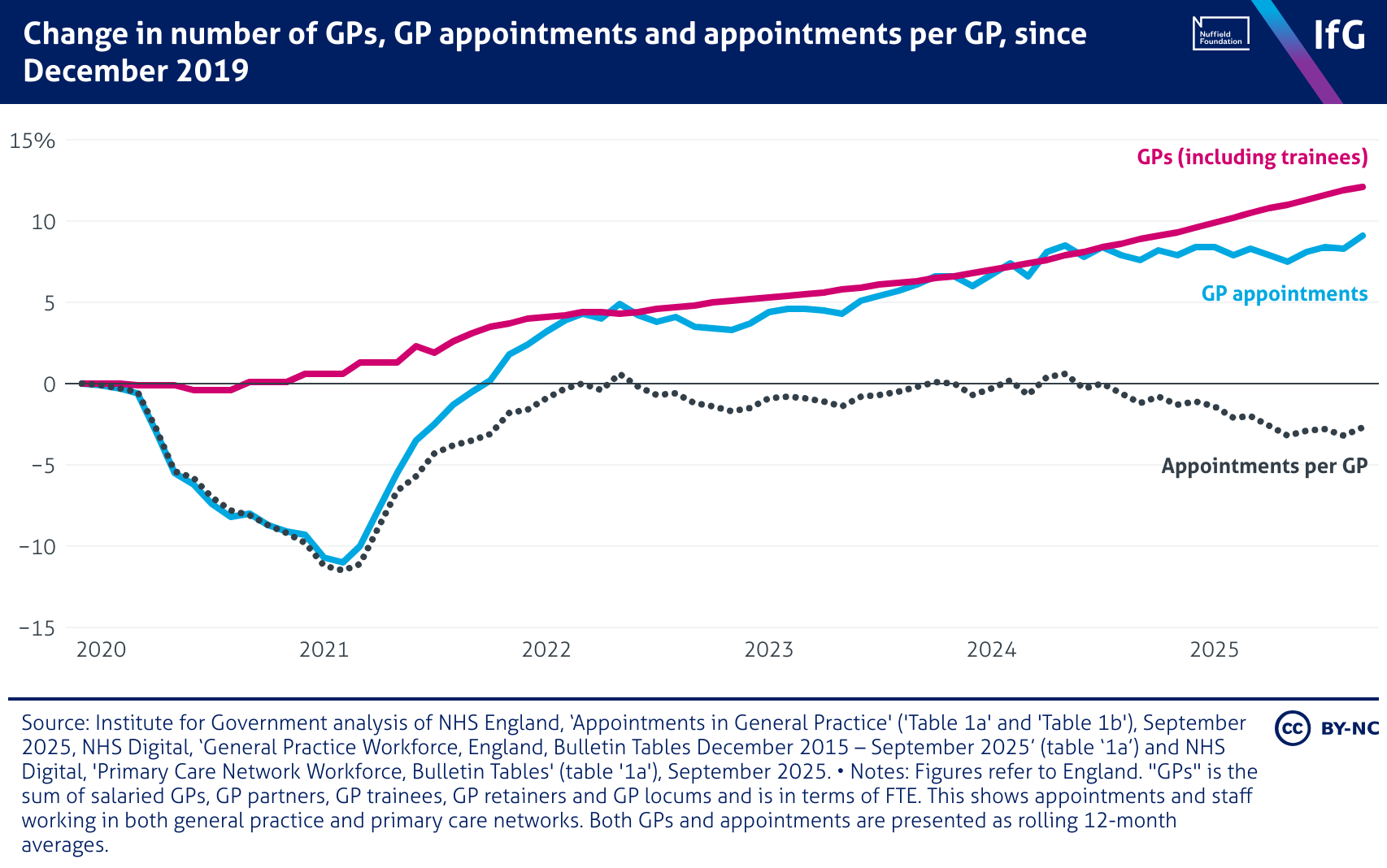 A line chart from the Institute for Government showing change in number of GPs, GP appointments and appointments per GP since December 2019, where GP numbers and appointments have both risen, but appointments per GP have fallen. The total number of GPs (including trainees) have increased by 12.1%, and appointments by 9.1%, while appointments per GP have dropped by nearly 3%.