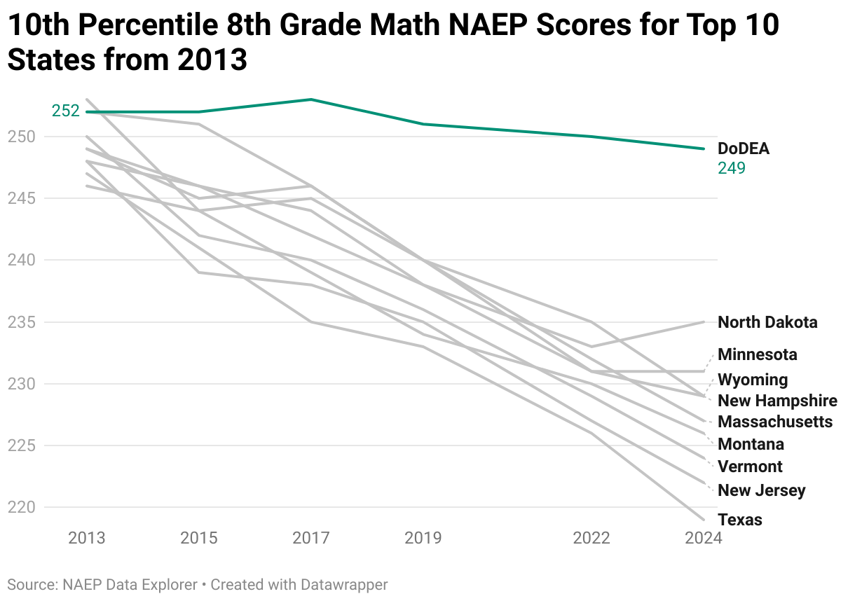 10th Percentile 8th Grade Math NAEP Scores for Top 10 States from 2013
