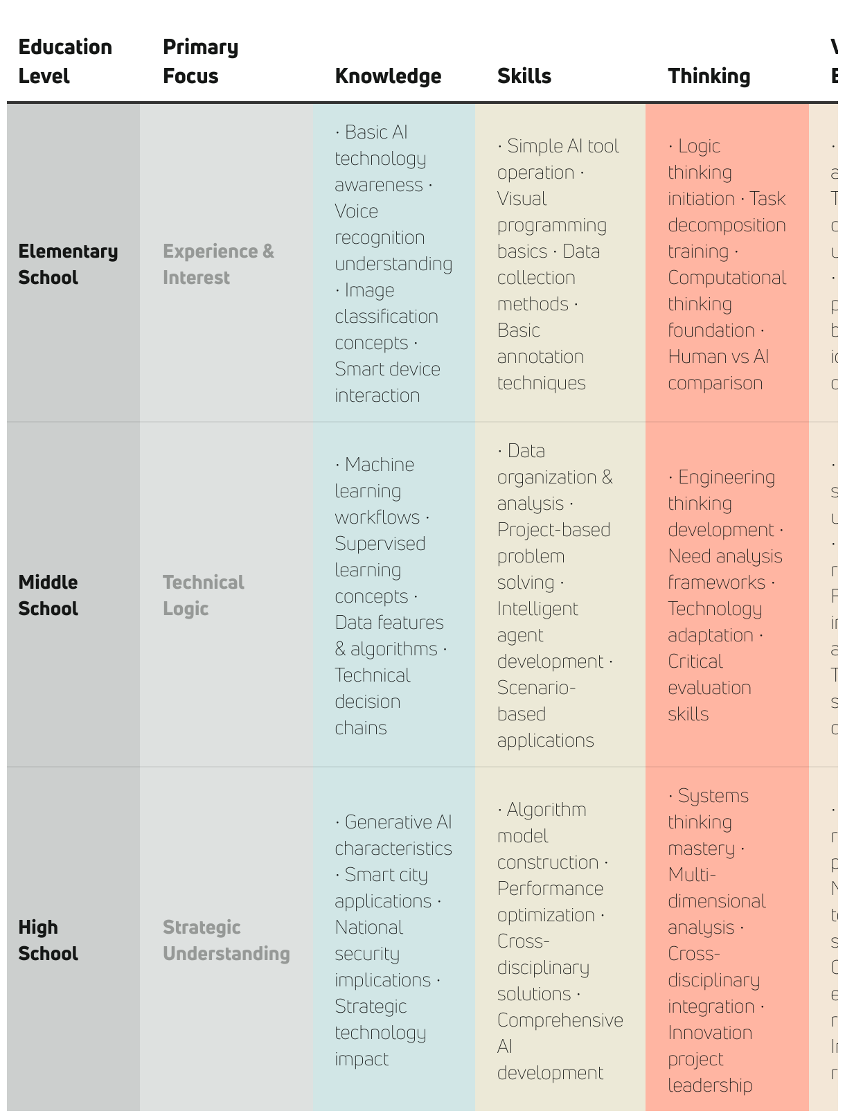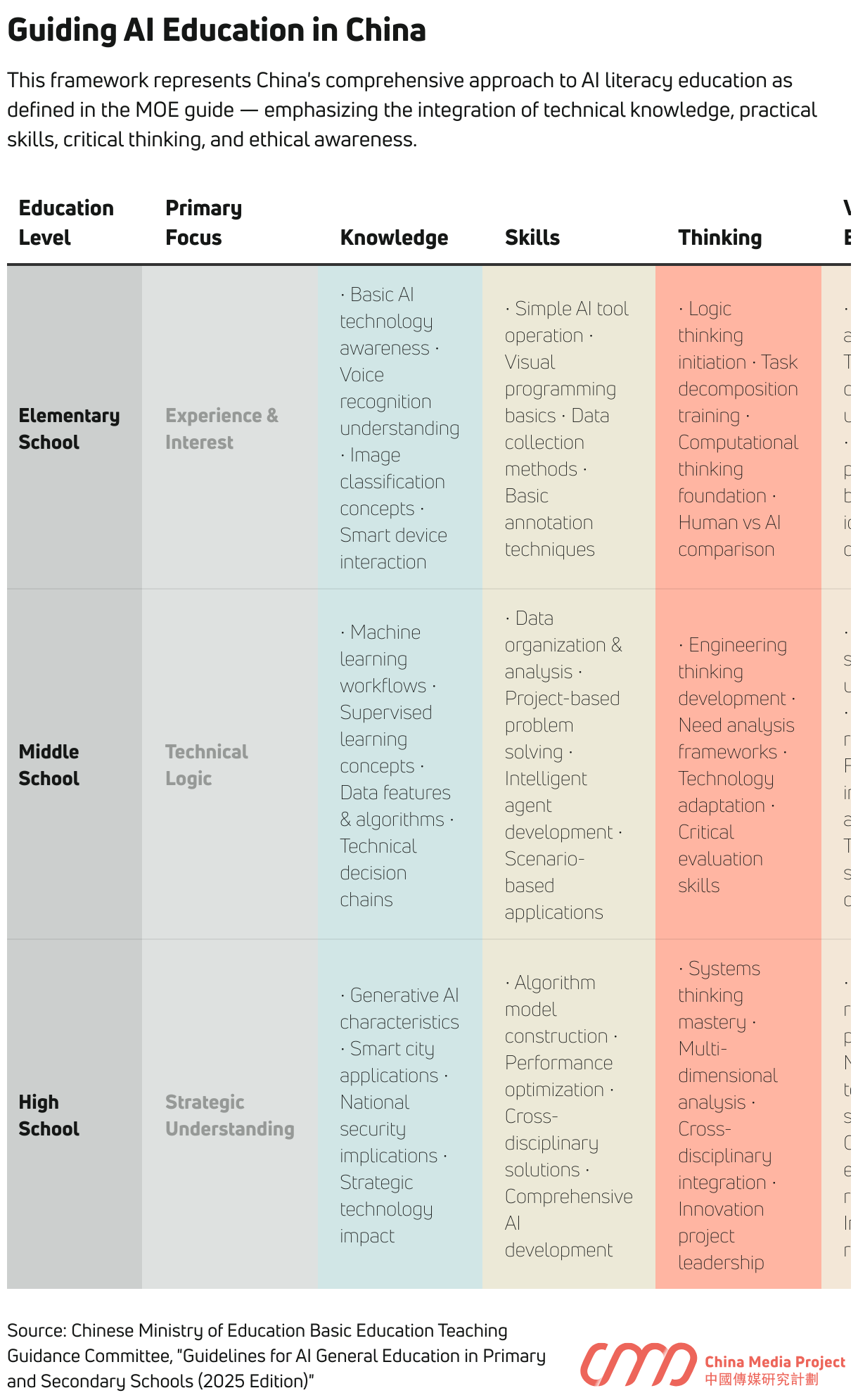 This framework represents China's comprehensive approach to AI literacy education as defined in the MOE guide — emphasizing the integration of technical knowledge, practical skills, critical thinking, and ethical awareness.