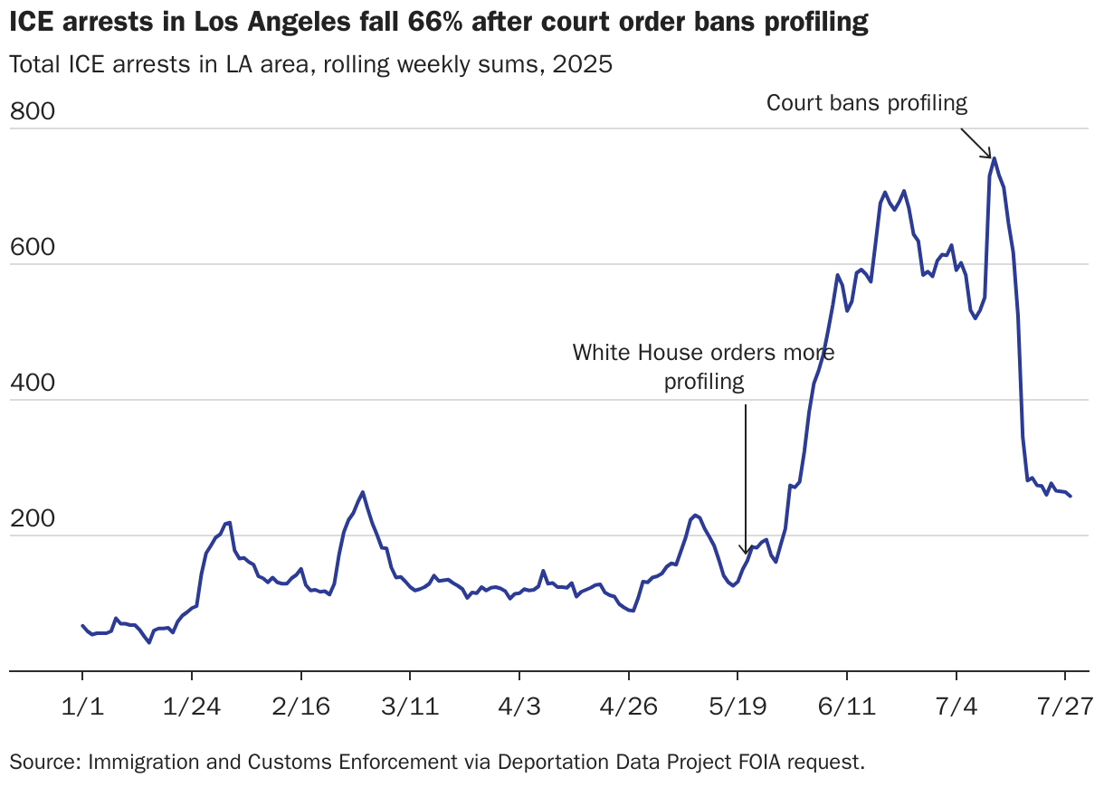 Total ICE arrests in LA area, rolling weekly sums, 2025