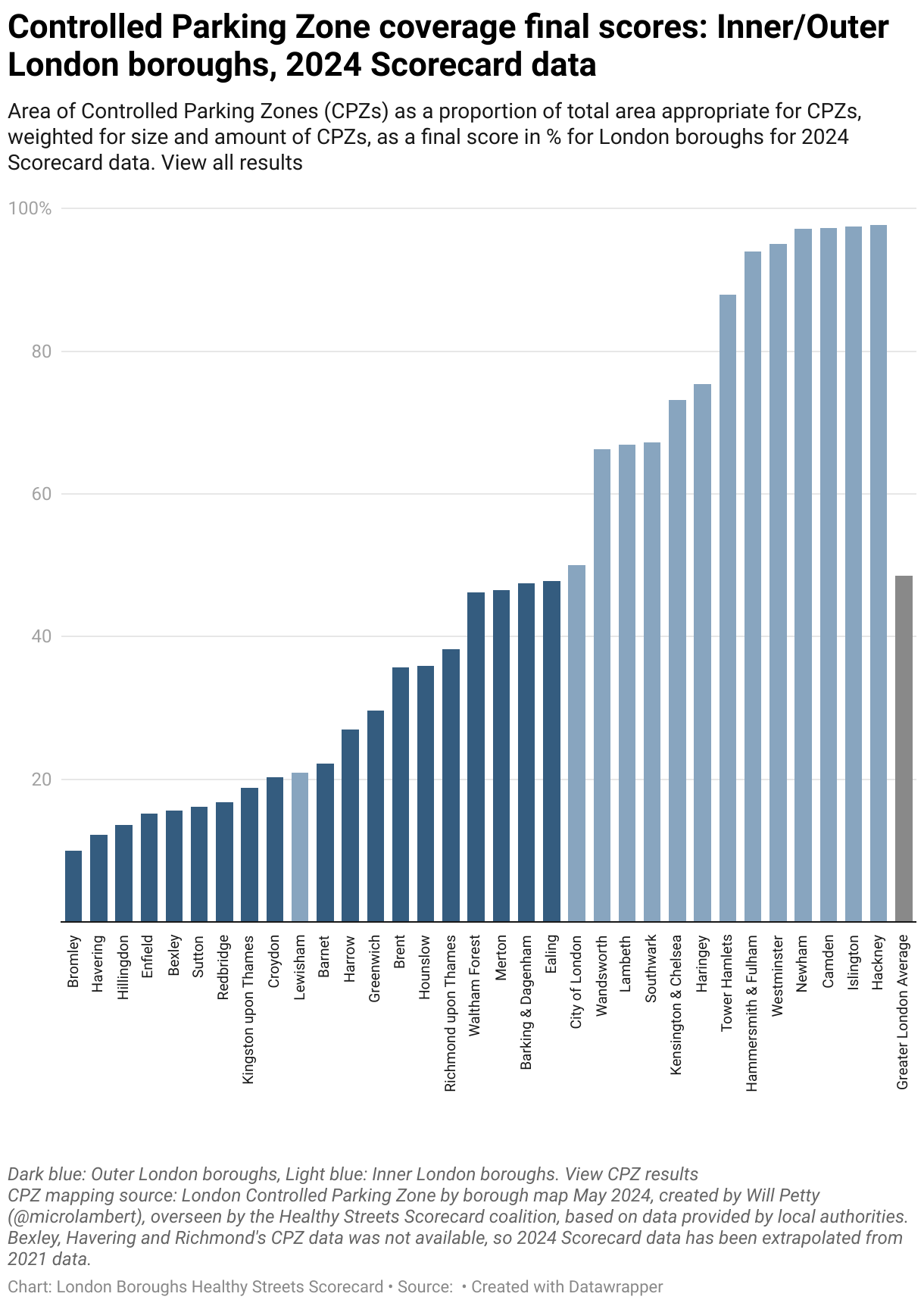 Controlled Parking Zone coverage final scores: Inner/Outer London boroughs, 2024 Scorecard data