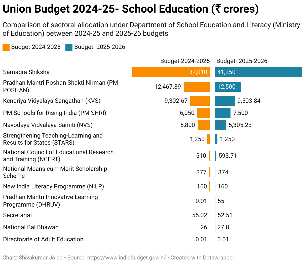 Comparison of sectoral allocation under Department of School Education and Literacy (Ministry of Education) between 2024-25 and 2025-26 budgets