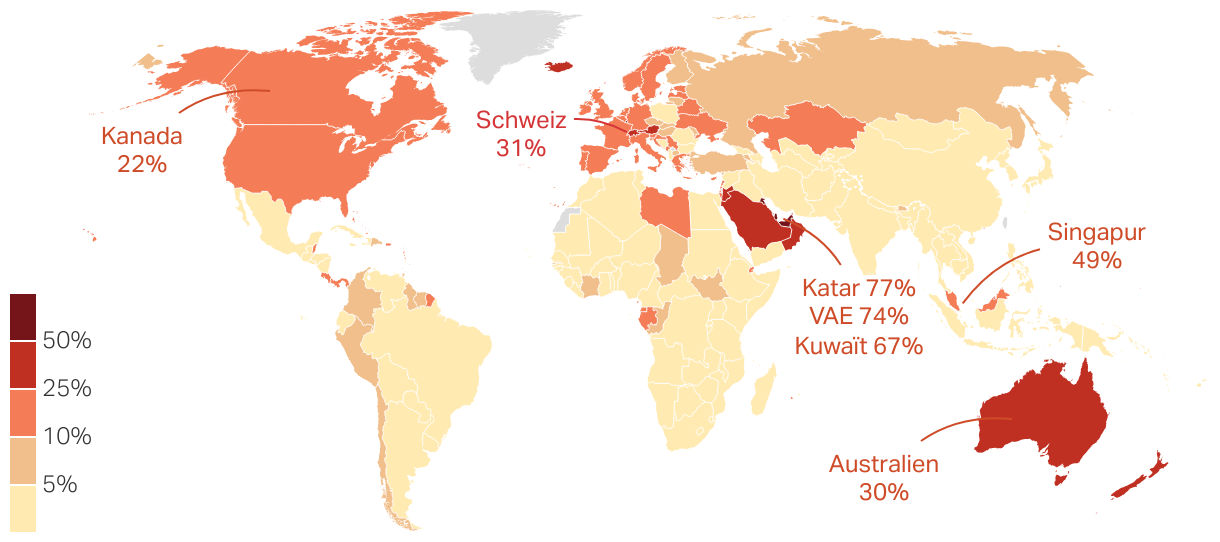 Anteil der internationalen Migrantinnen und Migranten an der Gesamtbevölkerung nach Land im Jahr 2024. Die mit Abstand höchsten Prozentsätze finden sich in den Golfstaaten.