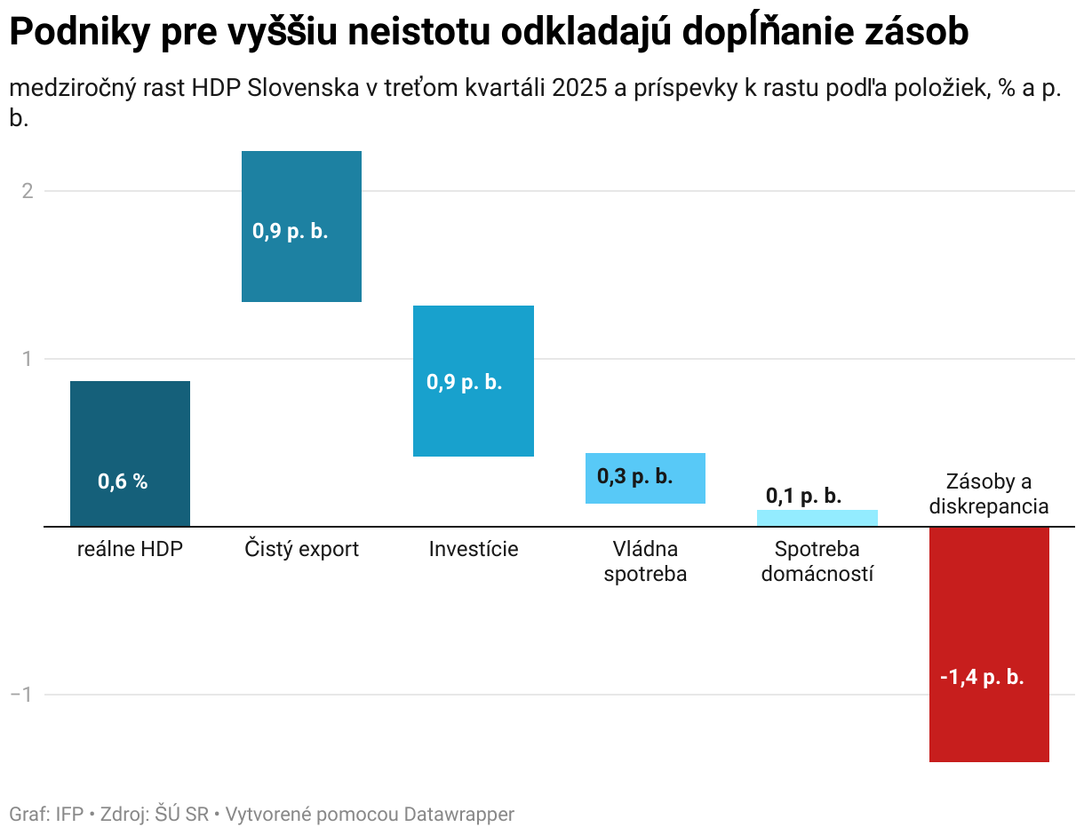 medziročný rast HDP Slovenska v treťom kvartáli 2025 a príspevky k rastu podľa položiek, % a p. b.