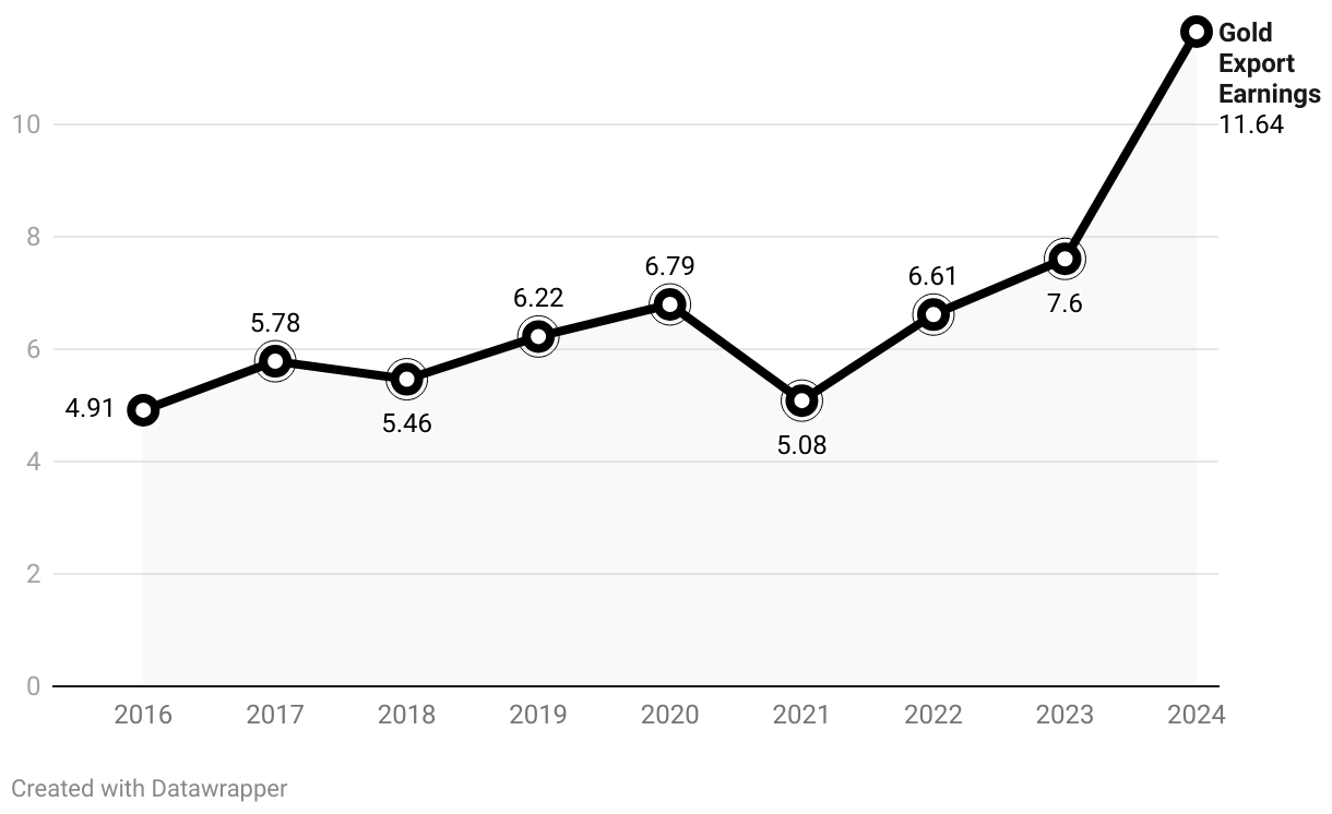 The graph shows trend of gold export earnings over an eight-year period