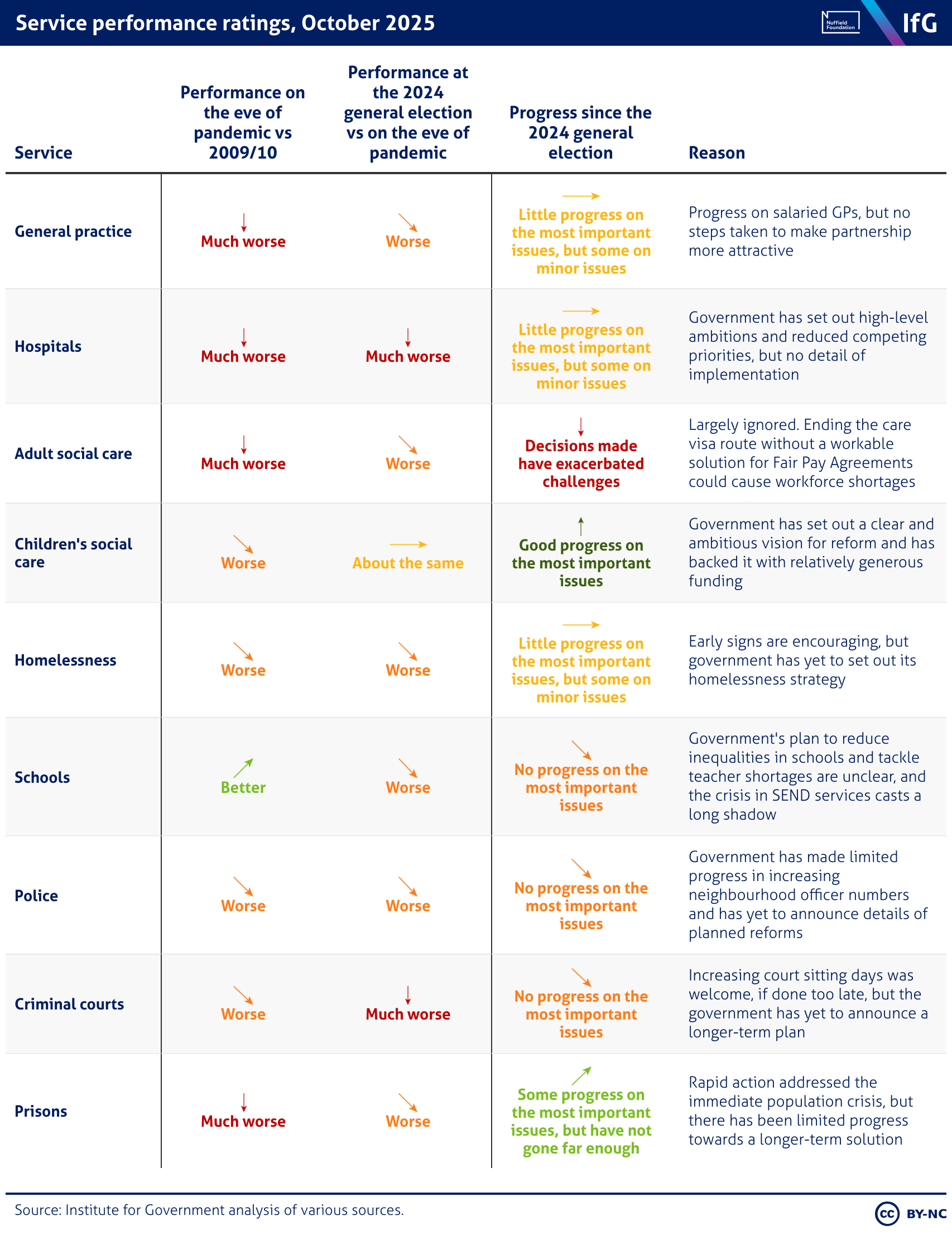 A table from the Institute for Government showing performance ratings of services covered in the IfG's Performance Tracker publication as of October 2025