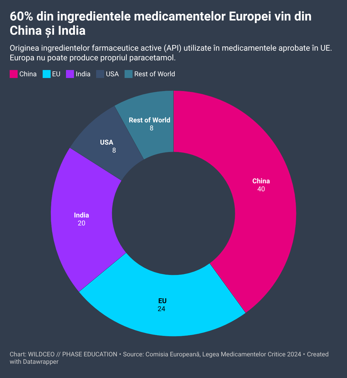 Donut chart illustrating that 60% of Europe's medicine ingredients are sourced from China and India. Highlights the EU's pharmaceutical supply chain dependency on non-European manufacturers.