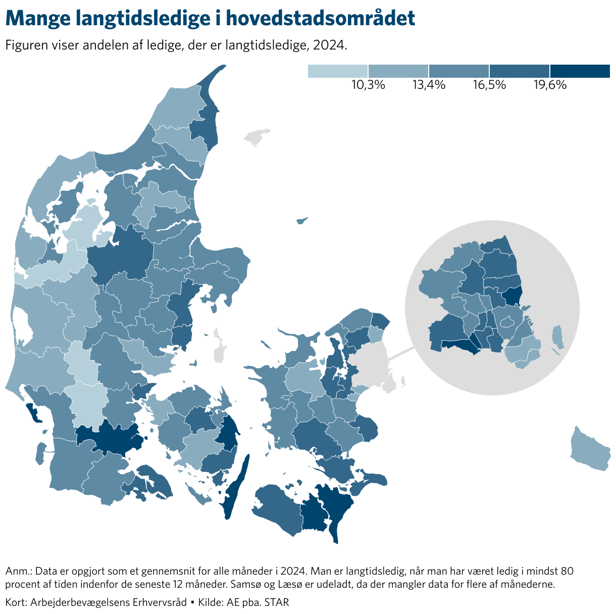Figuren viser andelen af ledige, der er langtidsledige, 2024.