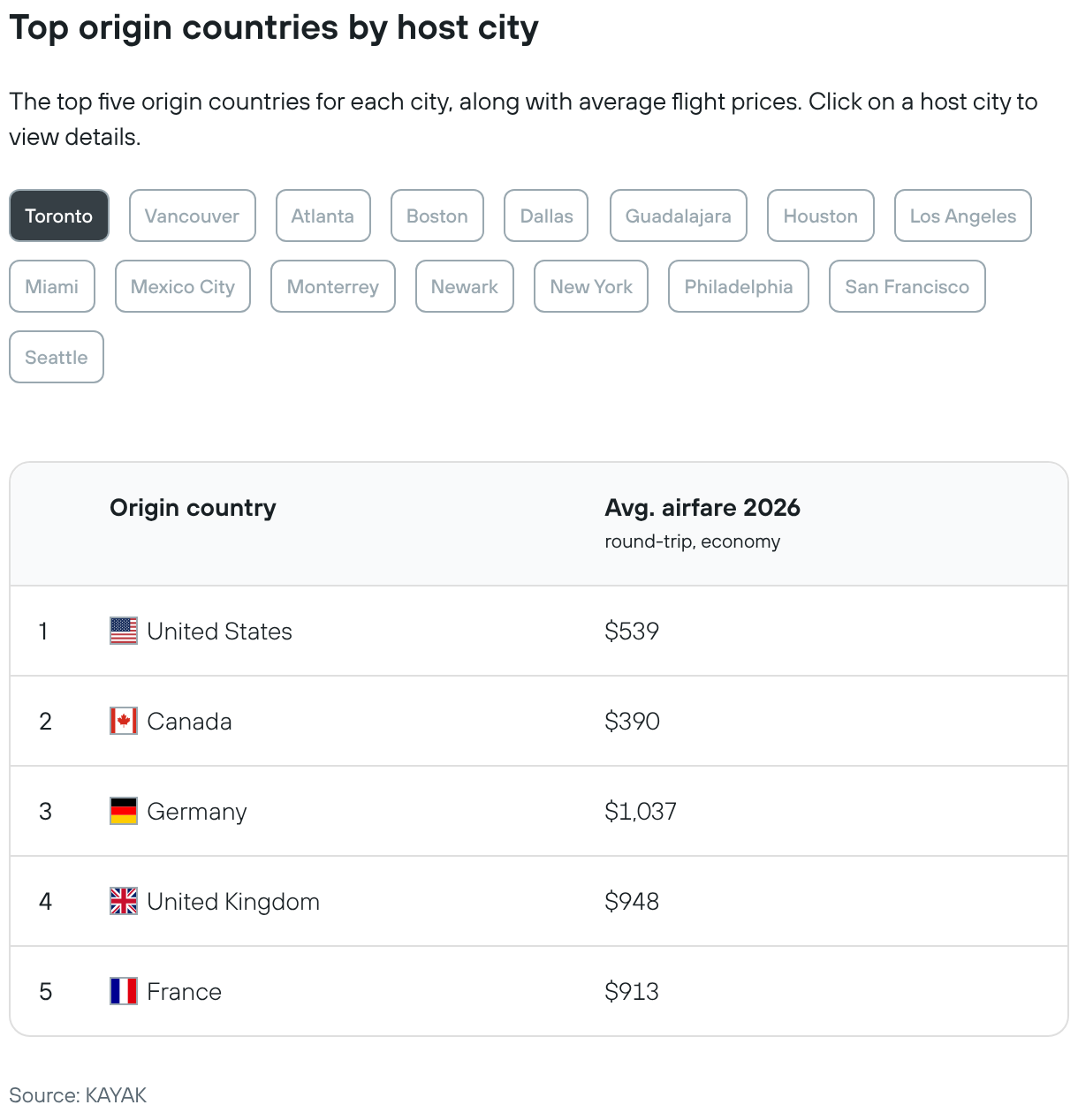 The top five origin countries for each city, along with average flight prices. Click on a host city to view details.