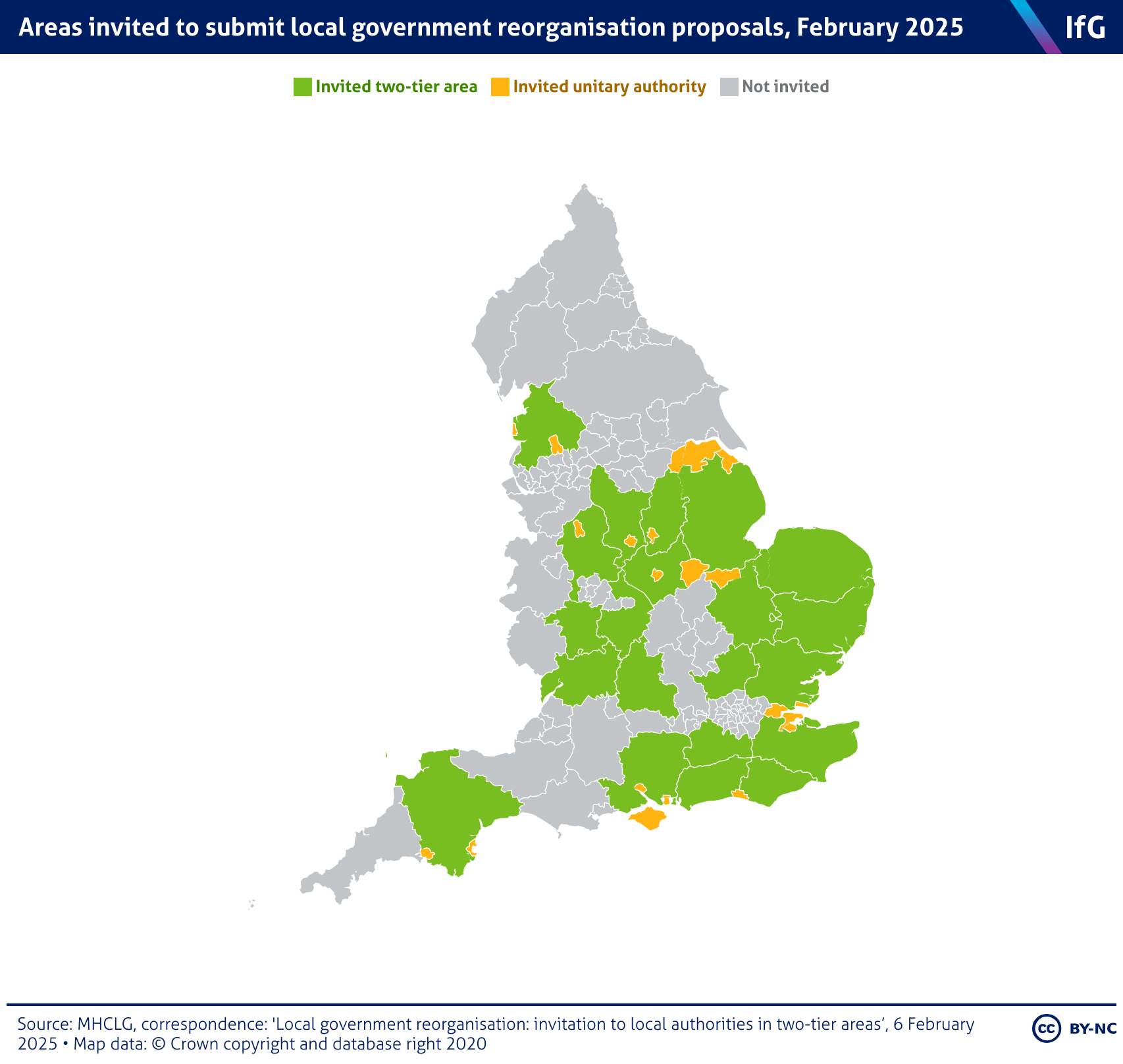 A map from the Institute for Government of areas invited to submit local government reorganisation proposals in February 2025 where 21 two-tier areas and 19 unitary authorities were invited.