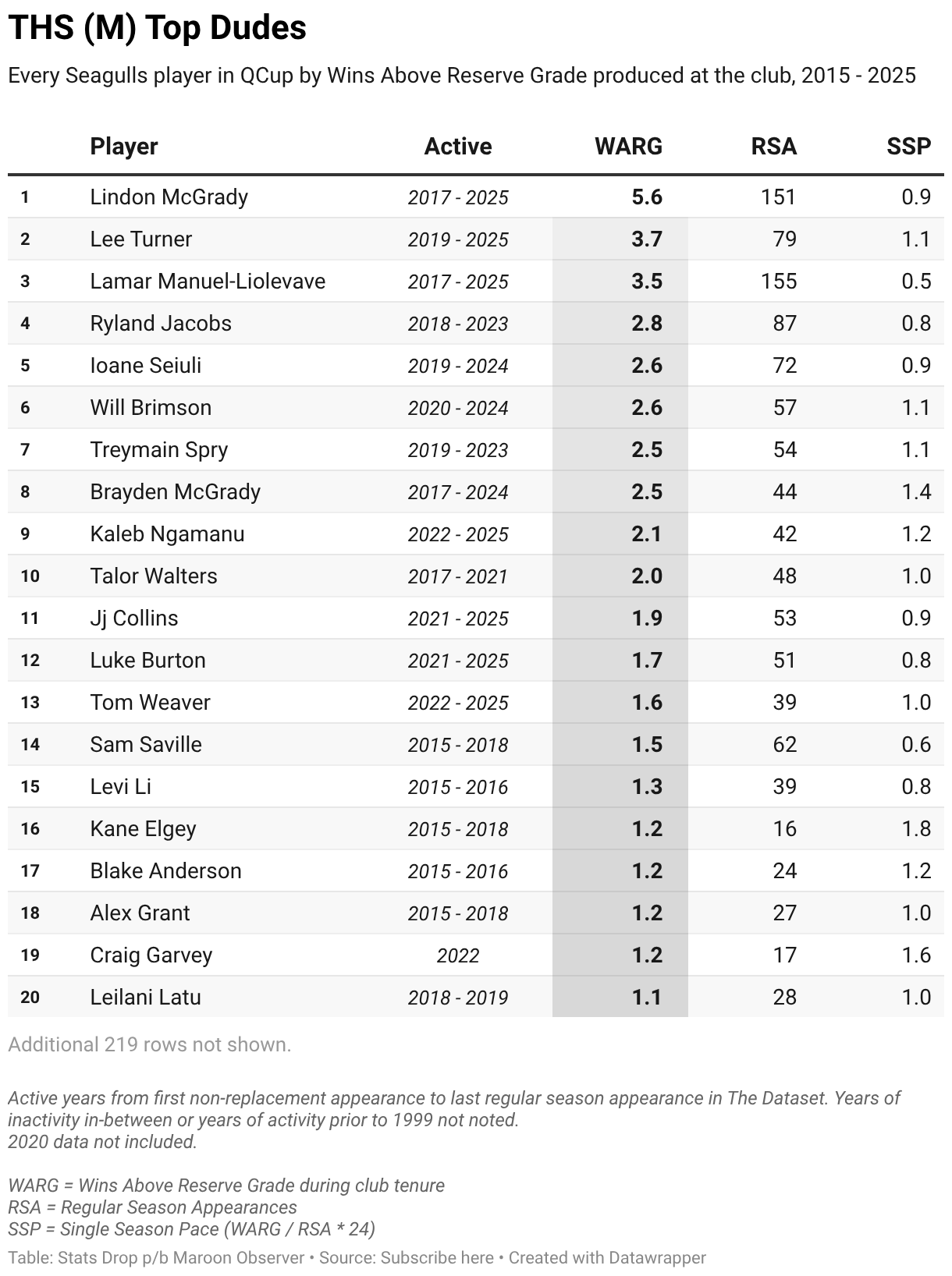 Every Seagulls player in QCup by Wins Above Reserve Grade produced at the club, 2015 - 2025