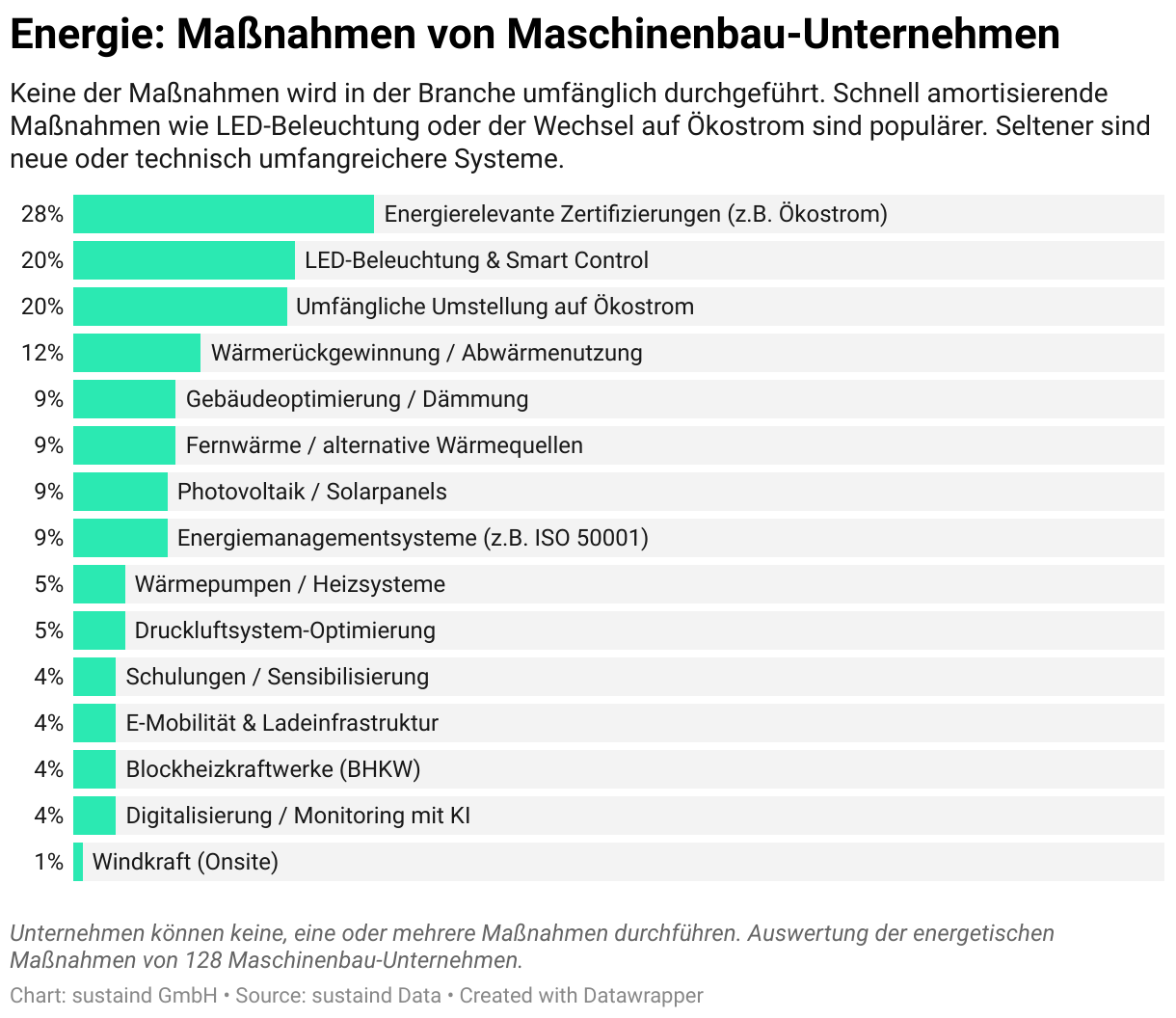 Keine der Maßnahmen wird in der Branche umfänglich durchgeführt. Schnell amortisierende Maßnahmen wie LED-Beleuchtung oder der Wechsel auf Ökostrom sind populärer. Seltener sind neue oder technisch umfangreichere Systeme.