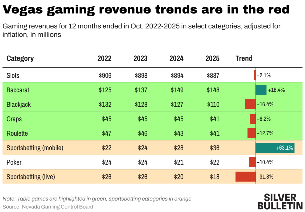 Gaming revenues for 12 months ended in Oct. 2022-2025 in select categories, adjusted for inflation, in millions