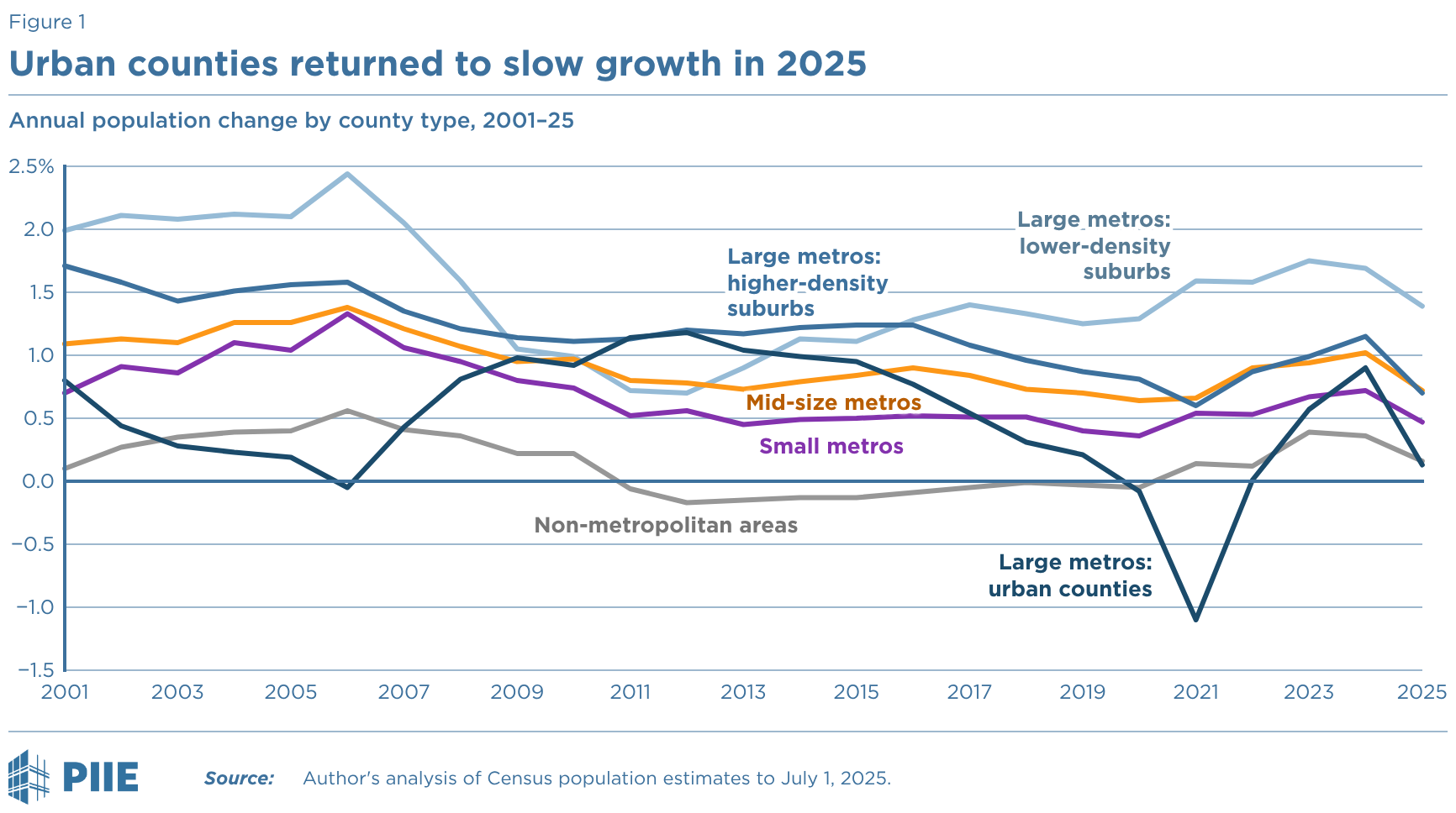 Annual population change by county type, 2001–25
