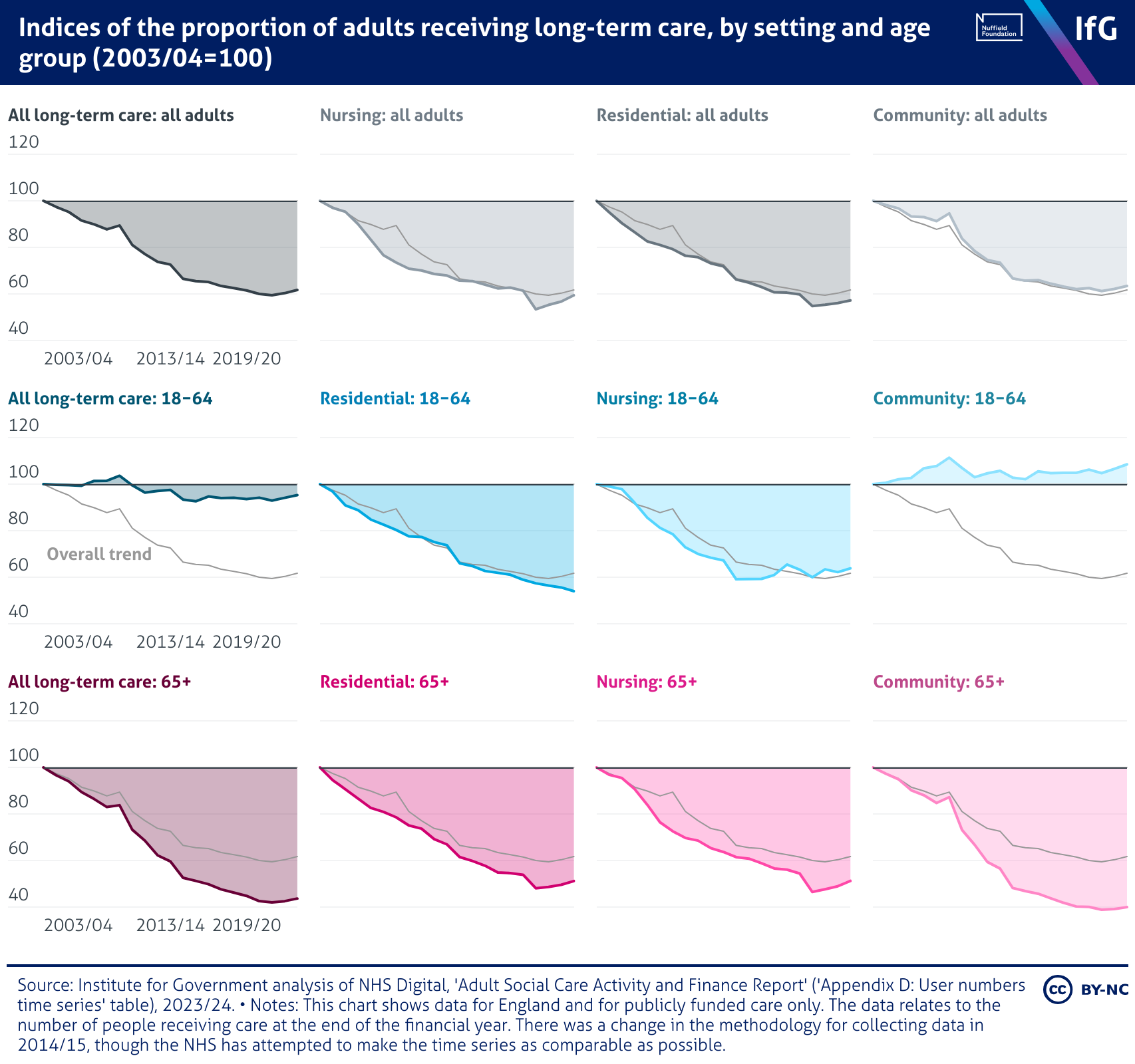 Indices of the proportion of adults receiving long-term care, by setting and age group (2003/04=100)