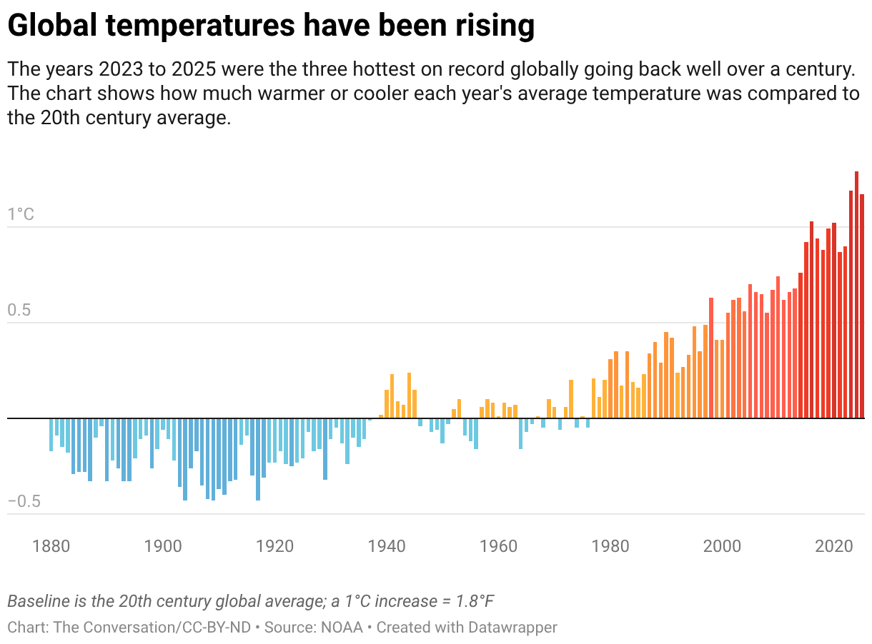 The years 2023 to 2025 were the three hottest on record globally going back well over a century. The chart shows how much warmer or cooler each year's average temperature was compared to the 20th century average.