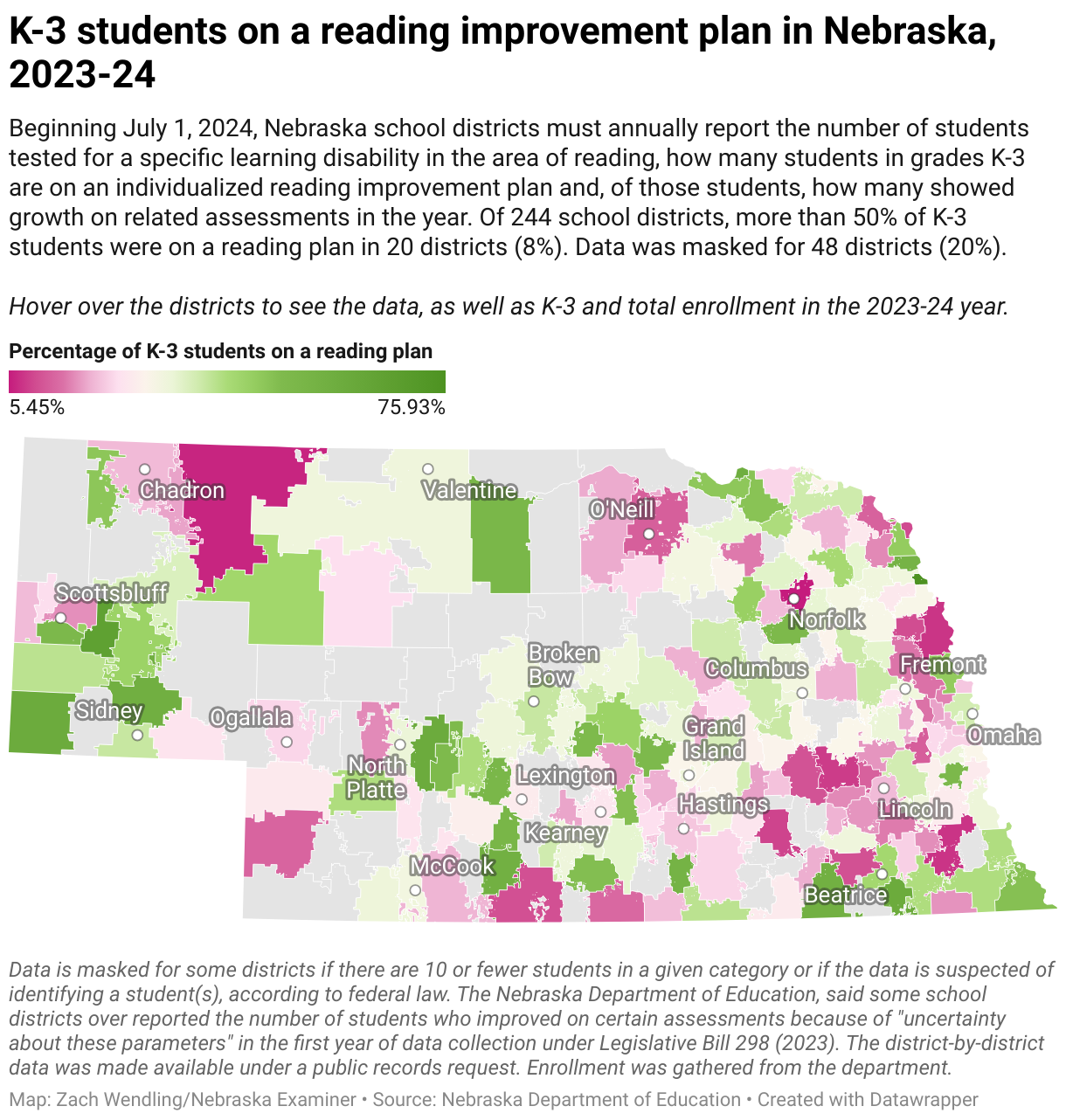 Beginning July 1, 2024, Nebraska school districts must annually report the number of students tested for a specific learning disability in the area of reading, how many students in grades K-3 are on an individualized reading improvement plan and, of those students, how many showed growth on related assessments in the year. Of 244 school districts, more than 50% of K-3 students were on a reading plan in 20 districts (8%). Data was masked for 48 districts (20%).