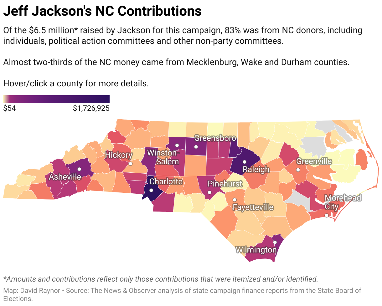 Of the $6.5 million* raised by Jackson for this campaign, 83% was from NC donors, including individuals, political action committees and other non-party committees.