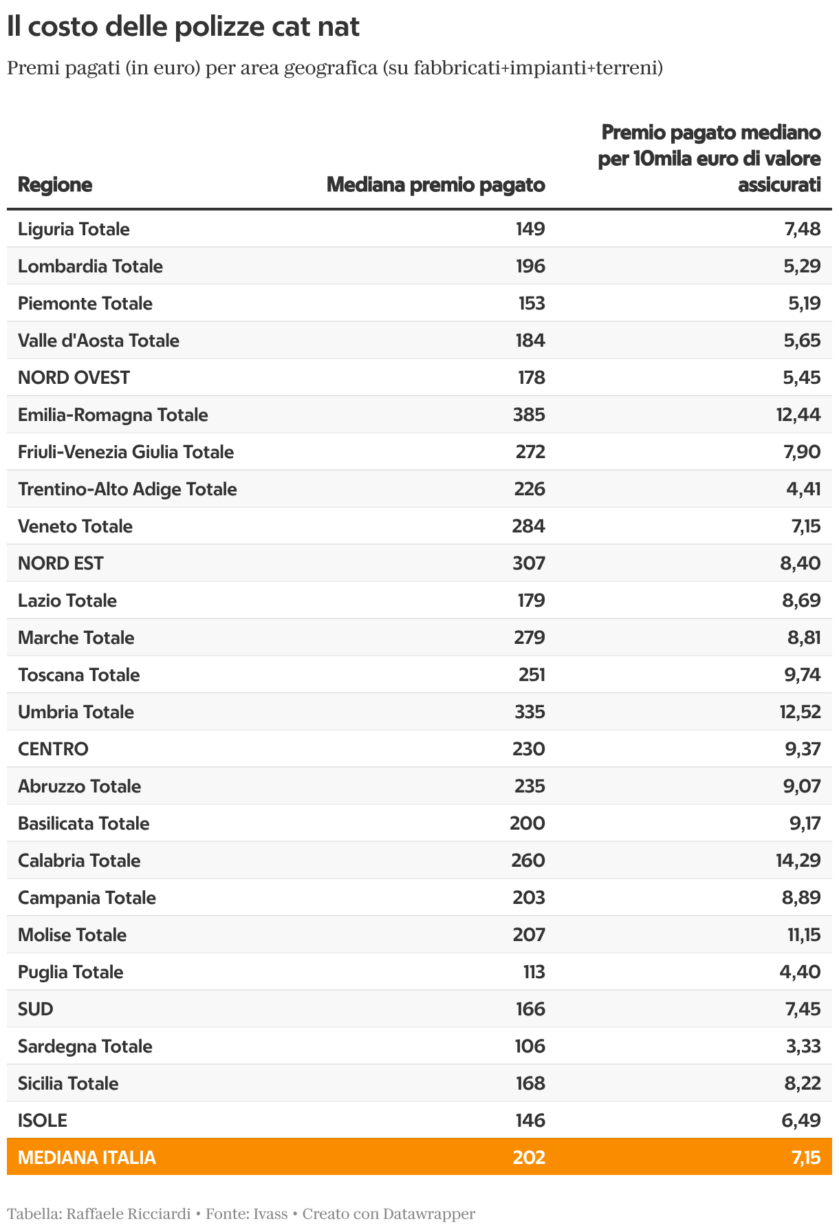 Premi pagati (in euro) per area geografica (su fabbricati+impianti+terreni)
