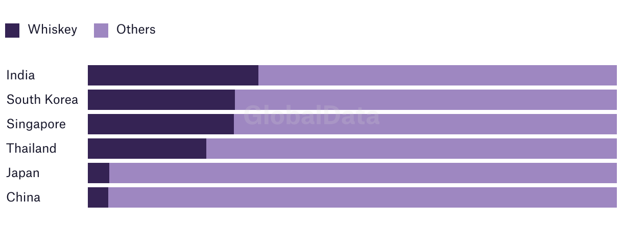 Market share of whiskey vs other spirits in the top Asian markets (million litres) - 2022