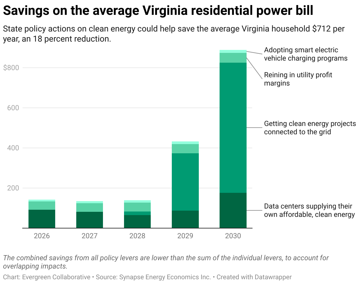 The average household in Virginia would save about $150 every year from 2026 to 2028 and about $712 in 2030 as a result of the state implementing clean energy policies.