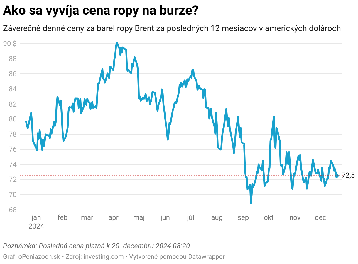 Záverečné denné ceny za barel ropy Brent za posledných 12 mesiacov v amerických dolároch