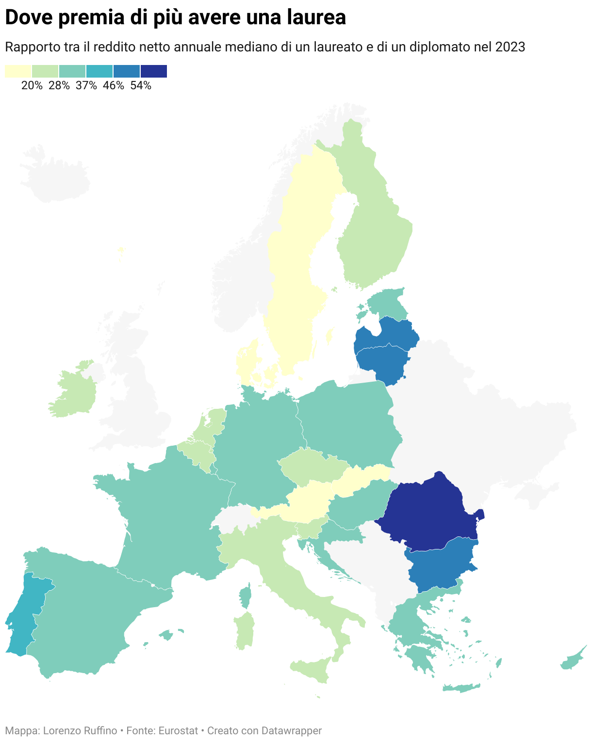 Rapporto tra il reddito netto annuale mediano di un laureato e di un diplomato nel 2023