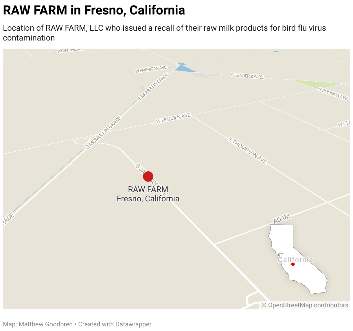 Location of RAW FARM, LLC who issued a recall of their raw milk products for bird flu virus contamination