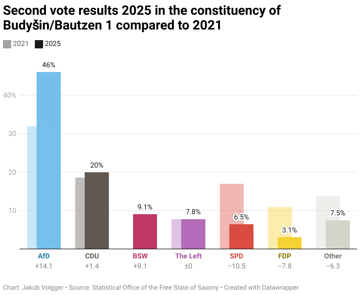 Second vote results 2025 in the constituency of Budyšin/Bautzen 1 compared to 2021