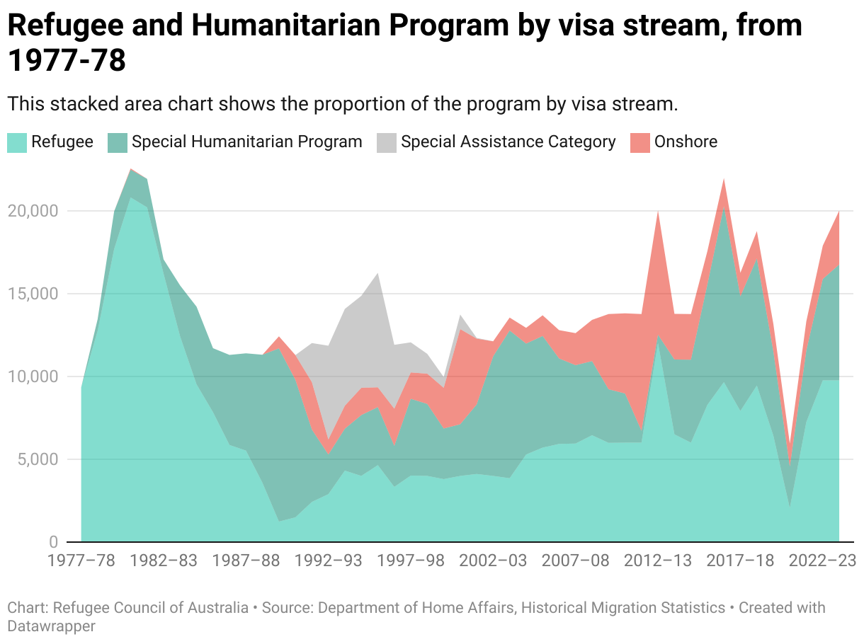 Stacked area chart showing originally a high number of refugee visas and an increasingly large proportion of Special Humanitarian visas, with a small proportion of onshhore visas later and a peak of Special Assistance Category visas in the early to mid 1990s.