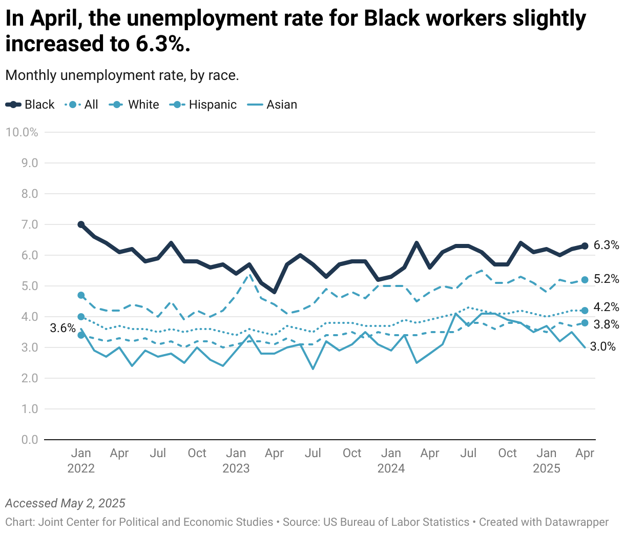 Monthly unemployment rate, by race.